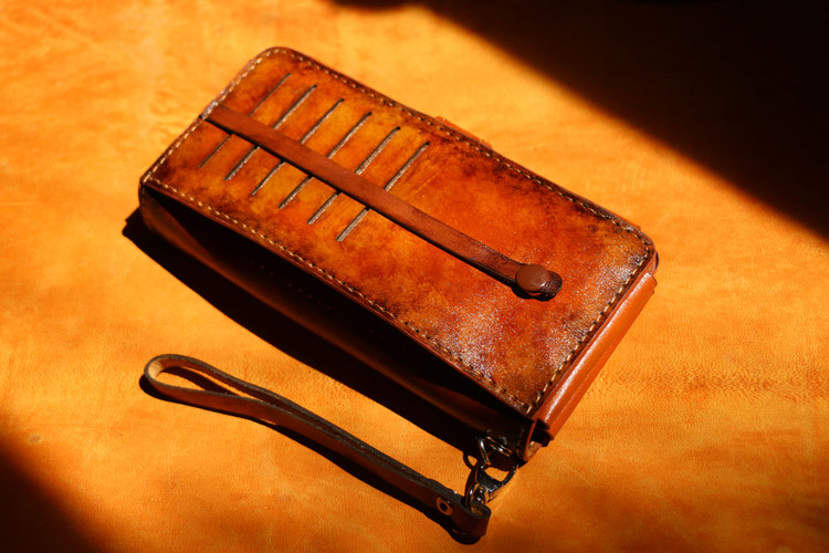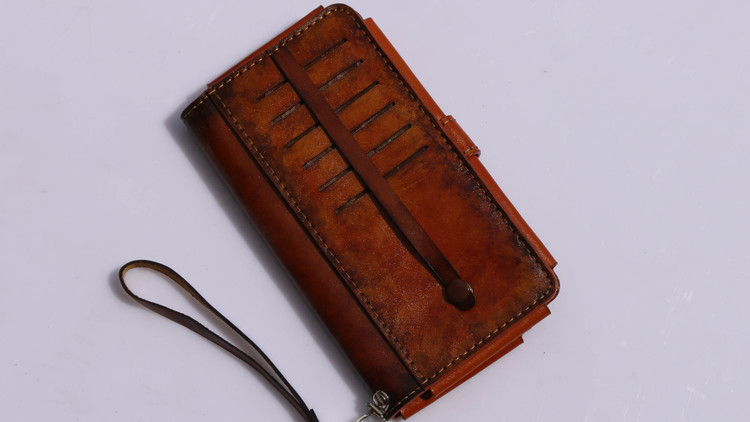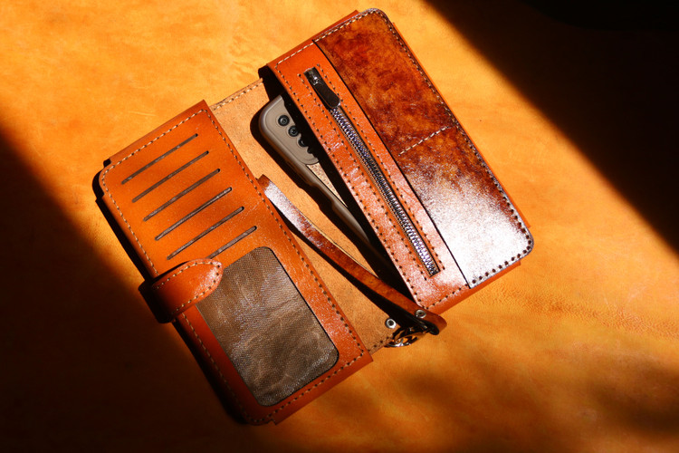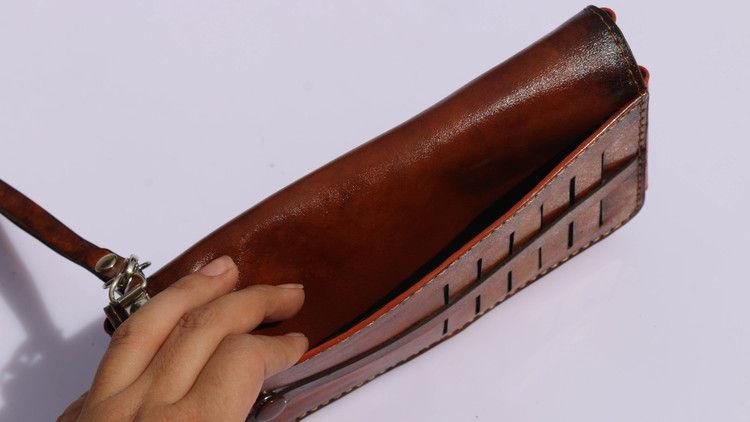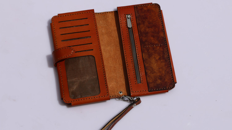 دست دوز،دوخته شده با نخ ابریشم،دو جای اسکناس،یک جای گوشی،چهارده جای کارت،یک زیپ برای سکه و فلش