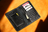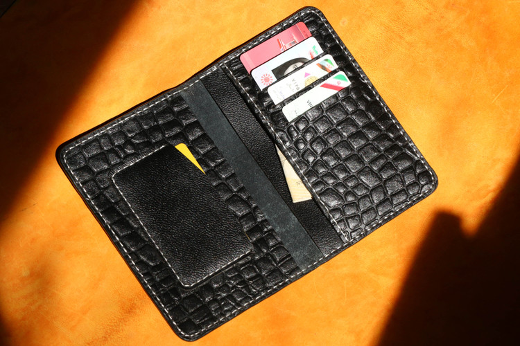 دوخته شده با چرم طبیعی.دستدوز.دارای پرداخت لبه 5جای کارت مجزا دارد. 2جای شناسنامه.یک جای بیمه نامه
