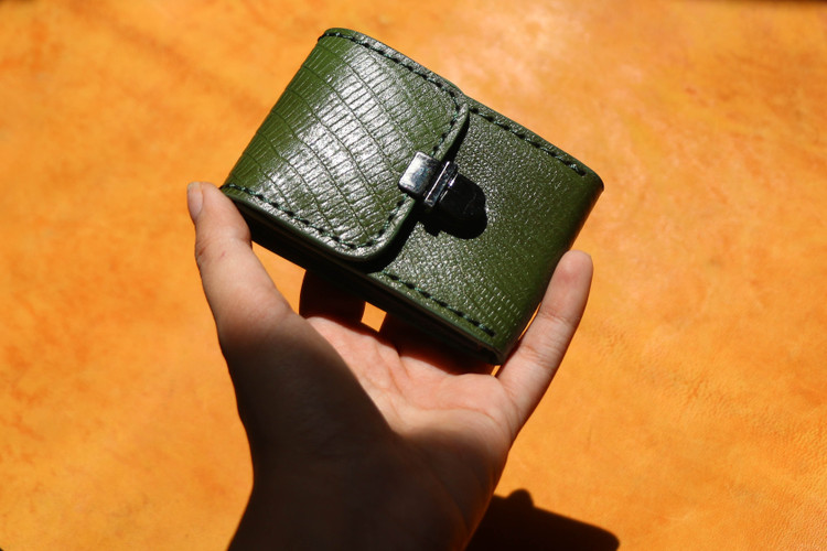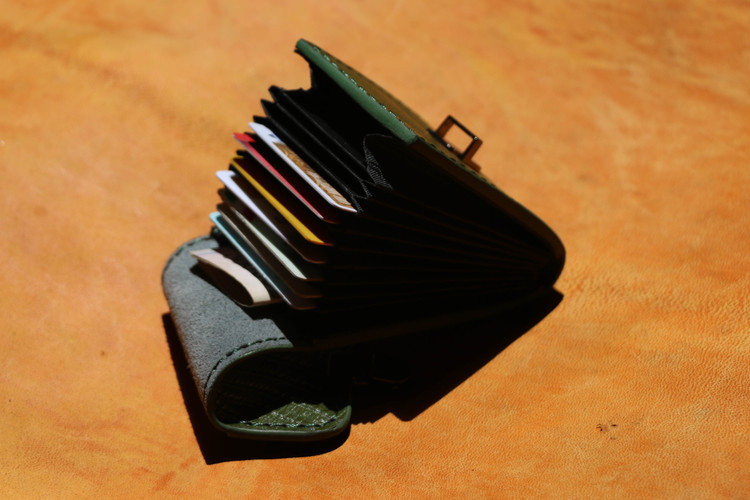 دوخته شده از چرم گاوی .دستدوز . دارای پرداخت لبه . امکان جایگذاری 11 تا8 کارت . دارای قفل