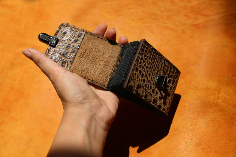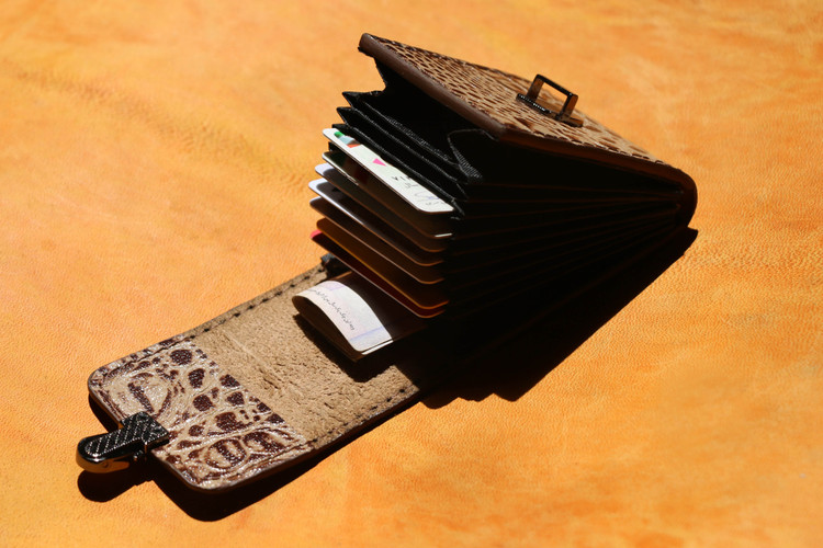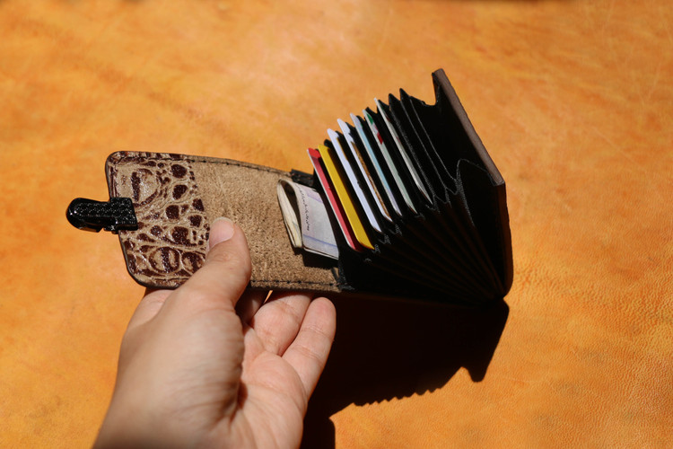 دوخته شده از چرم طبیعی .دستدوز . دارای پرداخت لبه . امکان جایگذاری 11 تا8 کارت . دارای قفل