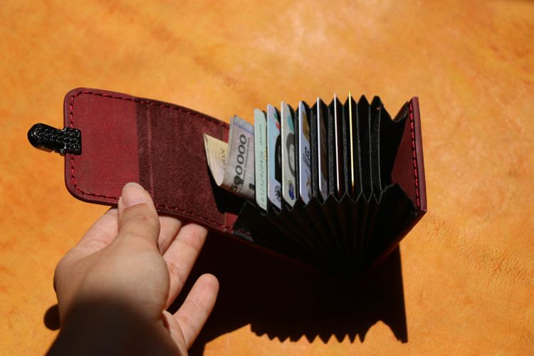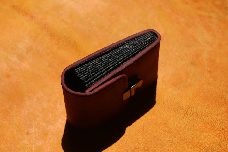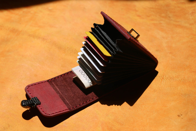 چرم هورس شتری .دستدوز و دارای پرداخت لبه . دارای 11 الی 18 جای کارت