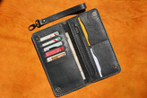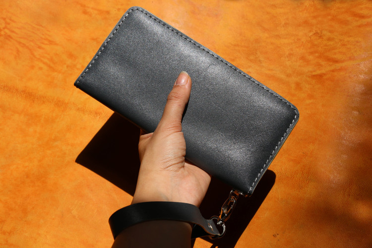 دوخته شده از چرم هورس شتری .دستدوز . دارای پرداخت لبه . 2جای اسکناس دارد . یک زیپ برای سکه و فلش . 8جای کارت . دارای بند دستی