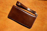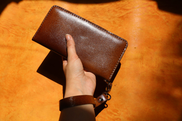 دوخته شده از چرم هورس شتری .دستدوز . دارای پرداخت لبه . 2جای اسکناس دارد . یک زیپ برای سکه و فلش . 8جای کارت . دارای بند دستی