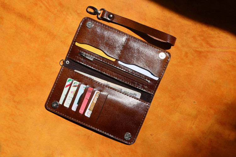 جزئیات: دوخته شده از چرم هورس شتری .دستدوز . دارای پرداخت لبه . 2جای اسکناس دارد . یک زیپ برای سکه و فلش . 8جای کارت . دارای بند دستی