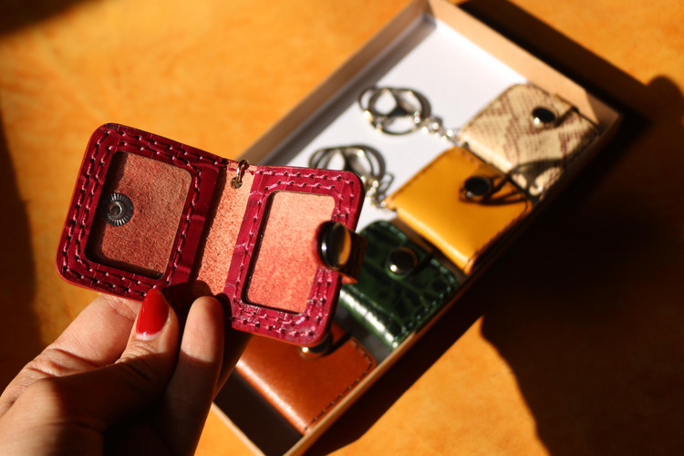 دستدوز .دارای پرداخت لبه .جای دو عکس دارای حلقه جاکلیدی وآویز کیف