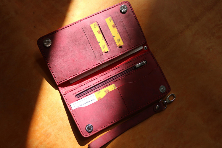 8جای کارت مجزا.2جای اسکناس مجزا . 1زیپ برای فلش وسکه و.... دستدوز .دارای پرداخت لبه .بند دستی جداشونده