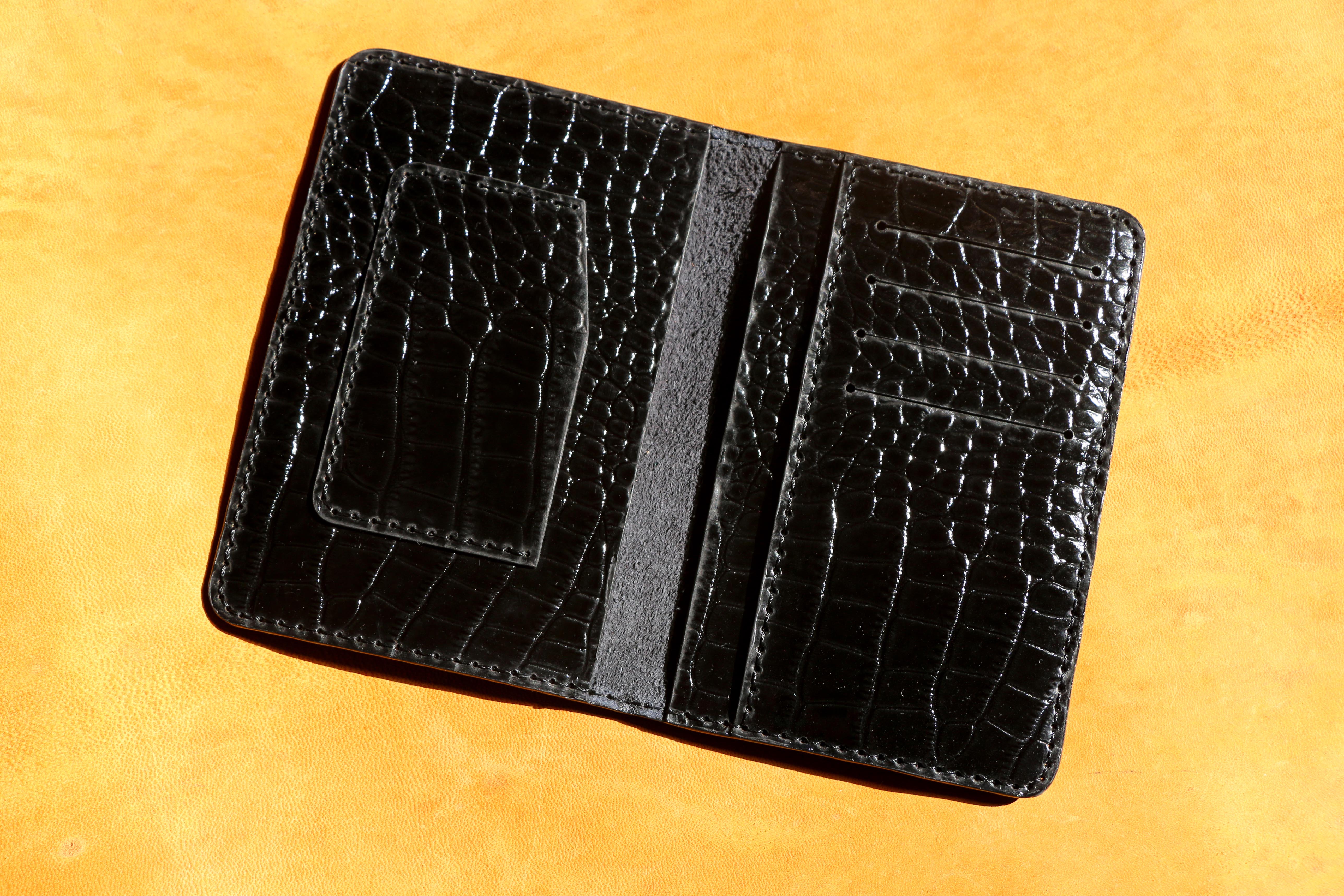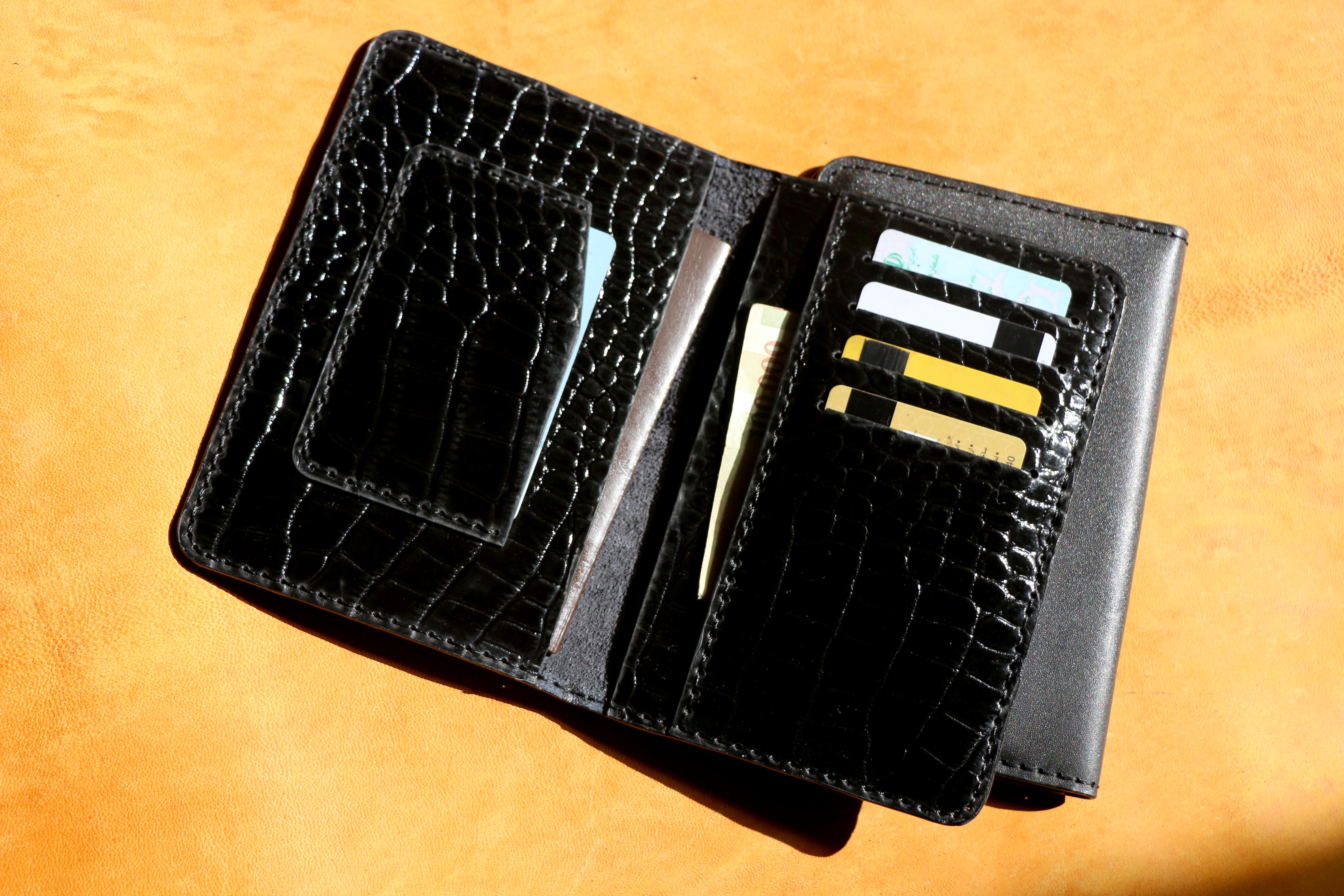 دارای پرداخت لبه . دستدوز .دارای 2 جای اسکناس .یک جای بیمه نامه یا اسکناس بصورت تاشده . 5جای کارت مجزا دارد